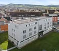 • Two-story building, white facade, large window, metal railing, concrete yard, wooden bench, distant mountain, neighboring building