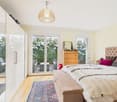• King size bed, large windows, balcony, white wardrobes, wooden floor, white bed linens