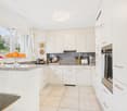 • Spacious modern kitchen with white cabinets, stainless steel appliances including a dishwasher, and a large window providing natural light and a view of the outdoors.