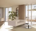 • Spacious bedroom with a minimalist design, featuring a large bed, built-in storage units, and a TV mounted on the wall. The room has a neutral color palette with wooden accents, creating a warm and cozy atmosphere. A balcony or terrace is visible, providi