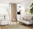 • Open-plan studio apartment with a bed, sofa, coffee table, and built-in storage units. The room has large windows and a glass partition separating the living and sleeping areas. The apartment appears to have a balcony or terrace accessible from the living