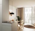 • Open-plan studio apartment with a kitchen area, dining table, and a bedroom area with a bed and nightstands. The kitchen features modern appliances including a dishwasher. The room has large windows, light-colored walls, and a pendant light fixture.