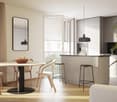 • The image shows a modern and stylish kitchen and dining area. The kitchen features sleek white cabinets and a stainless steel appliance, likely a dishwasher. The dining area has a round table with chairs, and a large window provides natural light. The ove