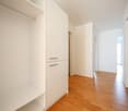 • tiled floor, white walls, large hallway, open door leading to another room, large wardrobe