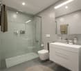 • Bathroom with shower, glass shower enclosure, white toilet and sink, soap dish and hair dryer