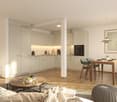 Spacious open-plan living area with large sliding glass doors leading to a balcony or terrace, hardwood floors, modern kitchen with white cabinets and appliances