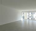 • Empty room, 3 windows, white walls, gray floor, outside view of city