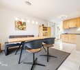 • kitchen with granite countertops, electric appliances, wooden table, two chairs, cupboards