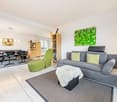 • Open-plan living space with large windows, wooden floors, sofa, coffee table, side table, armchairs, rug, wooden cabinet, potted plant, mirror, picture frame.