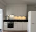 • modern kitchen with black countertops, white tiled floor, black dining table, and folding chair, small black appliance cabinet, trash bin