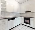 • empty room, beige tiles, white walls, red curtains, windows, kitchen area with integrated oven