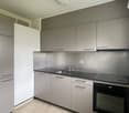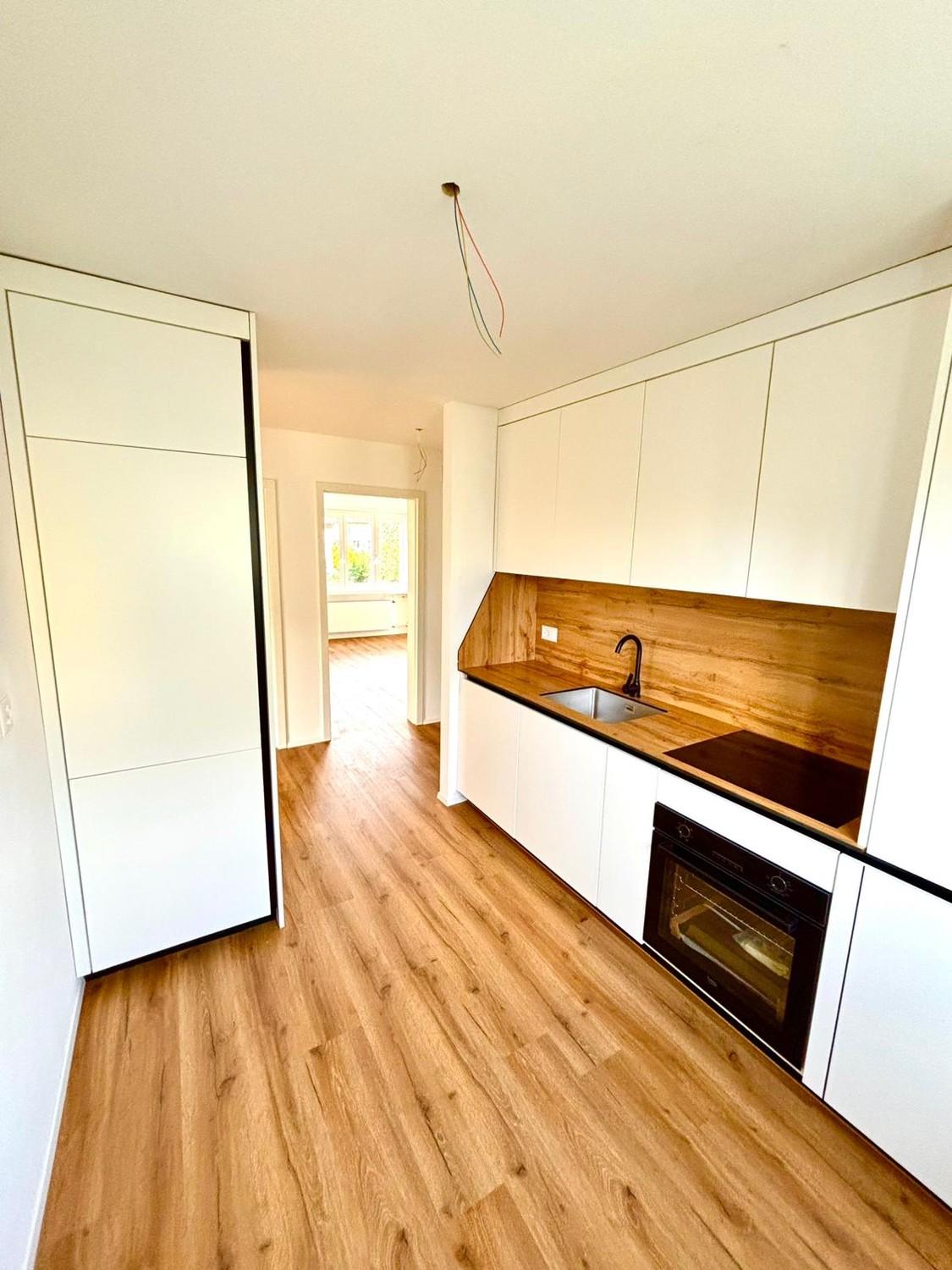 • A modern and clean kitchen with wooden floors and white cabinets, a sink, and an oven. There is a window leading to a small balcony and a bright white room in the back.