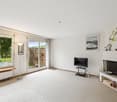 • Modern living room, white walls, wooden floor, glass doors, large windows, indoor plants, wooden table, comfortable seating, TV and media cabinet