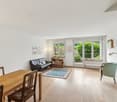 • wooden floor, open kitchen, large windows, dining table, comfortable seating