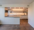 • Modern kitchen with central island, stainless steel appliances, white walls, wooden flooring, ceiling lamp, open shelves, under cabinet lighting, glass sink, stainless steel faucet, double sinks