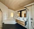 • White tiles on walls and floor, wooden ceiling, bathtub, shower, towel rack, sink