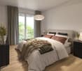 • The image shows a residential development with a mix of traditional half-timbered houses and modern apartment buildings. The buildings are surrounded by greenery and there are people walking and cycling along the road. The development appears to have balc