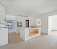 • minimalistic style, sliding glass door, large windows, hardwood floors, built-in storage, modern artwork