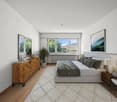 • Spacious bedroom with wooden ceiling, large windows overlooking a scenic outdoor view, white bedding, wicker furniture, and curtains covering the sliding glass door leading to a balcony or terrace.