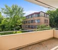 • Multi-story apartment building with brick and concrete exterior, multiple balconies, and a paved outdoor area with seating and landscaping