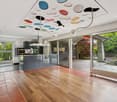 • Spacious dining room with large windows overlooking the outdoors, wooden dining table and chairs, shelving unit with dishware, and pendant lighting fixtures.