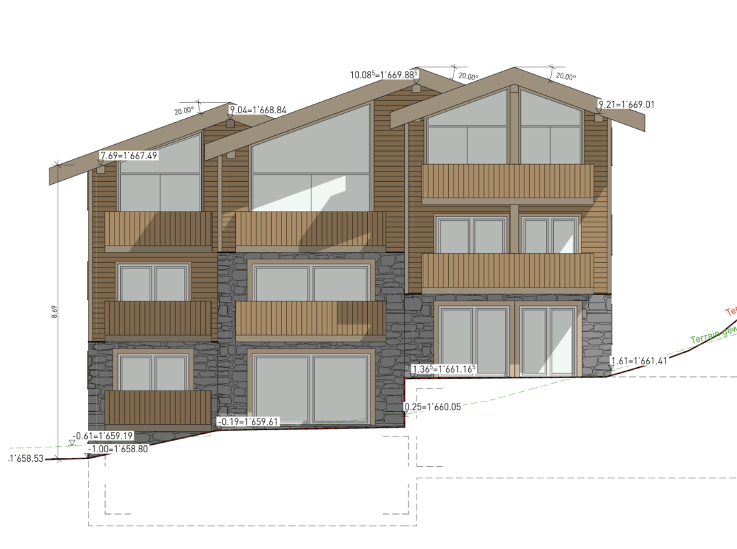 Einzigartig und Nachhaltig In der atemberaubenden Kulisse von Zermatt, wo majestätische Berge die Himmelsgrenze küssen, entsteht ein faszinierendes Mehrfamilienhaus, das nicht nur durch moderne Architektur, sondern auch durch die exquisite Verwendung von Stein und nachhaltig gewonnenem Holz besticht. Hier vereinen sich zeitgemäßes Design und die zeitlose alpine Baukunst zu einem harmonischen Gesamtkunstwerk, das sowohl Augen als auch Herzen berührt.Architektur und Design:Das geplante Gebäude wird in drei Etagen aufblühen und insgesamt sechs exklusive Wohneinheiten beherbergen.Zwei traumhafte Dachgeschosswohnungen: eine mit 4.5 Zimmern und eine mit 2.5 Zimmern, beide verzaubern mit Decken aus bestem Lärchenholz und einem atemberaubenden Blick auf das mächtige Matterhorn.Zwei lichtdurchflutete 3.5 Zimmerwohnungen im Obergeschoss, die mit großzügigen Balkonen und unvergesslichem Matterhornblick zum Verweilen einladen.Zwei Erdgeschosswohnungen, bei denen große Terrassen und ein einladender Vorplatz den perfekten Rückzugsort bieten.Die Fassade des Mehrfamilienhauses ist mit heimischem Holz und Stein verkleidet, dessen natürliche Schönheit nicht nur die Ästhetik bereichert, sondern auch hervorragende Dämmwerte bietet. Große Fensterfronten öffnen den Blick auf die majestätische Berglandschaft der Umgebung und bringen das Licht der Alpen in jede Wohnung.Wohnungsaufteilung:Dachwohnungen:Eine 4.5 Zimmerwohnung BGF ca. 145m2 und eine 2.5 Zimmerwohnung BGF ca. 64 m2 Wohnung mit MatterhornblickOffene Wohn- und Essbereiche mit modernen Küchen, die zum gemeinsamen Kochen und Feiern einladen. Helle, einladende Schlafzimmer, die harmonisch integrierte Stauraumlösungen bieten.Elegante Badezimmer, überschwemmt von Tageslicht und ausgestattet mit hochwertigen Armaturen - ein persönlicher Rückzugsort für entspannende Momente.Obergeschoss:Zwei 3.5 Zimmerwohnungen BGF ca. 104 m2, mit teilweise MatterhornblickGroßzügige Wohn- und Essbereiche mit Panoramafenstern, die den Blick auf die beeindruckenden Berge freigeben. Luxuriöse Master-Suiten mit eigenen Badezimmern und Ankleidebereichen, wo jeder Tag wie ein besonderer Anlass gefeiert werden kann. Weitere Schlafzimmer, die flexibel genutzt werden können, sowie der Zugang zu weitläufigen Balkonen, ideal für laue Abende, an denen man die alpine Landschaft bewundern kann.Erdgeschoss:Zwei 3.5 Zimmerwohnungen BGF ca. 104 m2 mit teilweise MatterhornblickLichtdurchflutete Wohn- und Essbereiche mit Panoramafenstern und zauberhaftem Bergblick. Eigene energetische Rückzugsorte in Form luxuriöser Master-Suiten und variabel nutzbarer Schlafzimmer. Großzügige Terrassen und ein einladender Vorplatz perfektionieren die Harmonie von Innen und Außen und bieten einen idealen Rahmen für gesellige Abende unter dem Sternenhimmel.Technische Ausstattung:Dieses Mehrfamilienhaus wird mit modernster Technologie ausgestattet, um höchsten Komfort und nachhaltige Lebensweise gleichzeitig zu gewährleisten.Heizungsanlage:Eine energieeffiziente Erdsonde mit Fußbodenheizung sorgt für ein behagliches Raumklima, während der Energieverbrauch erheblich gesenkt wird. Jedes Zimmer ist mit dieser wohltuenden Fußbodenheizung ausgestattet.Fahrstuhl:Ein großzügiger Fahrstuhl bietet barrierefreien Zugang zu allen Etagen - ein durchdachtes Detail, das Familien und älteren Menschen zugutekommt.Materialien und Qualität:Besonderer Wert wird auf die Auswahl der Materialien gelegt. Der Einsatz von nachhaltig gewonnenem Holz, edlen Natursteinen und erstklassigen Armaturen gewährleistet nicht nur ein stilvolles Ambiente, sondern garantiert auch die Langlebigkeit und Beständigkeit des Gebäudes. Die Innenräume sollen den Luxus hochwertiger Bodenbeläge, eleganten Holzverkleidungen und moderner Beleuchtungselemente in sich tragen - ein Ausdruck von Qualität und zeitlosem Stil, der die Sinne verzaubert und ein Gefühl von Heimat vermittelt. Fazit:Der Neubau des Mehrfamilienhauses in Zermatt repräsentiert ein herausragendes Wohnprojekt, das höchste Ansprüche erfüllt. Durch die Kombination von erstklassiger Qualität, nachhaltigen Bauweisen und faszinierendem Design entsteht ein Lebensraum, der sowohl die Schönheit der Natur respektiert als auch modernes Wohnen in alpiner Umgebung neu interpretiert.Mit besten GrüßenIhr Horu Team