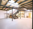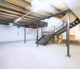 • Long, narrow hallway with concrete walls and floor, and a small window at the end. The hallway appears to be in a state of disrepair, with peeling paint and a generally unfinished appearance.