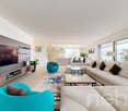 modern furniture, flat-screen TV, couch, wooden table, dining table and chairs, shelf with framed pictures, white walls