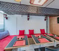• balcony, wooden table, black chairs, tiled floor, outdoor plants, wooden storage cabinet, glass door