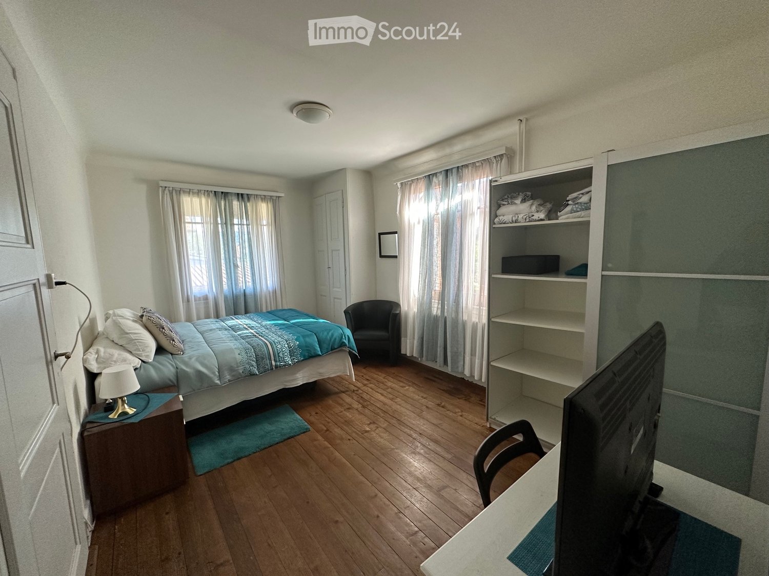 • Wooden floors, desk, chair, bed with pillows, blanket, carpet, lamp, mirror, tv