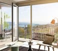 • Spacious balcony or terrace with panoramic view of a lakeside city, surrounded by hills and mountains. The balcony features comfortable outdoor furniture including wicker chairs and a small table.