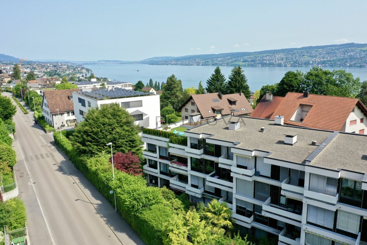 An einem äusserst ruhigen Einfamilienhausquartier (Tempo-30-Zone) in unmittelbarer Nähe zu Kindergärten, öffentlichen und privaten Schulen, mit ÖV bestens erreichbar liegt diese luxuriöse und einmalige Attikawohnung – ein Zuhause, das höchsten Wohnansprüchen gerecht wird.Highlights der Immobilie: • Wohnfläche: 230qm auf einer Ebene • Gesamtfläche inkl. Hobbyraum: 184qm • Raumhöhe: 2.53M • Zimmeranzahl: 7.5 • Unverbaubare Lage: Seesicht, Richtung Süd-Westen angrenzend an Waldrand und Richtung Süd-Osten angrenzend an Freihaltezone • Spektakuläre Terasse von 102 qm mit elegantem Holboden, ganztags besonnt • Lage: Top-Nachbarschaft, ruhig, zentral, familienfreundlich Ausstattung im Überblick: • Direkter Liftzugang • Hochwertiger Parkettboden in der gesamten Wohnung • Grosszügige Einbauschränke in allen Zimmern und im Eingangsbereich und Korridor • Elternschlafzimmer mit Ankleide und En-Suite Bad mit Dusch-WC und Dusche • Zweites Badezimmer mit Dusch-WC und Dusche • Gäste WC mit Waschturm • Drei Nasszellen, alle mit Fenstern • Elegant eingebaute Klimaanlagen in allen Zimmern • Beschattungsautomatik in der ganzen Wohnung Zusätzliche Flächen im Untergeschoss: • Ausgebauter Fitness-/Hobbyraum (ca. 22 qm) – vielseitig nutzbar • Zusätzlicher Kellerraum mit viel Stauraum Parkierung: • 1 Tiefgaragenplatz • Veloabstellraum vorhanden In an exceptionally quiet single-family house neighborhood (speed limit 30 km/h zone), in close proximity to kindergartens, public and private schools, and easily accessible by public transportation, lies this luxurious and unique penthouse apartment – a home that meets the highest standards of livability.Property Highlights: • Living area: 230 sqm on one level • Total area including hobby room: 184 sqm • Room height: 2.53 m • Number of rooms: 7.5 (three bedrooms) • Unobstructed location: lake view, facing southwest bordering forest edge, and facing southeast bordering open space • Spectacular terrace of 102 sqm with elegant wooden flooring, sunlit all day Location: Prime neighborhood, quiet, central, family-friendlyOverview of Features: • Direct elevator access • High-quality parquet flooring throughout the apartment • Spacious built-in wardrobes in all rooms, entrance area, and corridor • Master bedroom with walk-in wardrobe and en-suite bathroom • Second bathroom with shower • Guest WC with laundry tower • Three bathrooms, all with windows • Elegantly integrated air conditioning in all rooms and automatic shading of all rooms Additional Spaces in the Basement: • Finished fitness/hobby room (approx. 22 sqm) – versatile use • Additional cellar room with ample storage Parking: • 1 underground parking space • Bicycle storage room available