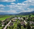 • Open-plan room with wooden floors, large glass doors leading to a balcony, a kitchen area, wooden beams on the ceiling, skylights, and a panoramic view of the mountains.