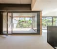 • modern building with yellow exterior, brick floor, glass doors, no furniture