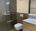 • Spacious bathroom with white tiled walls, beige tile flooring, a modern toilet, a wall-mounted sink, and a glass-enclosed shower area with a rainfall showerhead.