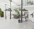 • The image shows a modern, two-story building with a concrete exterior and large glass windows. There is a garage door visible on the ground floor, indicating the presence of a garage. The building is surrounded by trees and greenery, giving it a natural,