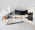 • tiled flooring, modern cabinets, marble countertop, integrated oven, glass backsplash, power outlet, kitchen drawers