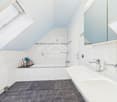 • Bathroom: with shower, sink, white tiles, white cabinetry, glass door