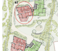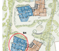 • The image shows a residential development with multiple apartment buildings. The building labeled 'B4' appears to be one of the apartment buildings in the complex. The surrounding area includes a landscaped garden with trees, shrubs, and a paved path.