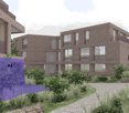 3-story modern brick building with large windows, balconies, and landscaped grounds