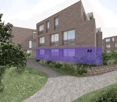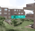 • Multi-story brick building with large windows, balconies, and a pink structure labeled 'B4' in the foreground. The building is surrounded by landscaping with trees and greenery.