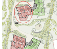The image shows a floor plan of a building complex. The circled area appears to be a parking lot or garage. The overall plan includes multiple buildings, green spaces, and other facilities.
