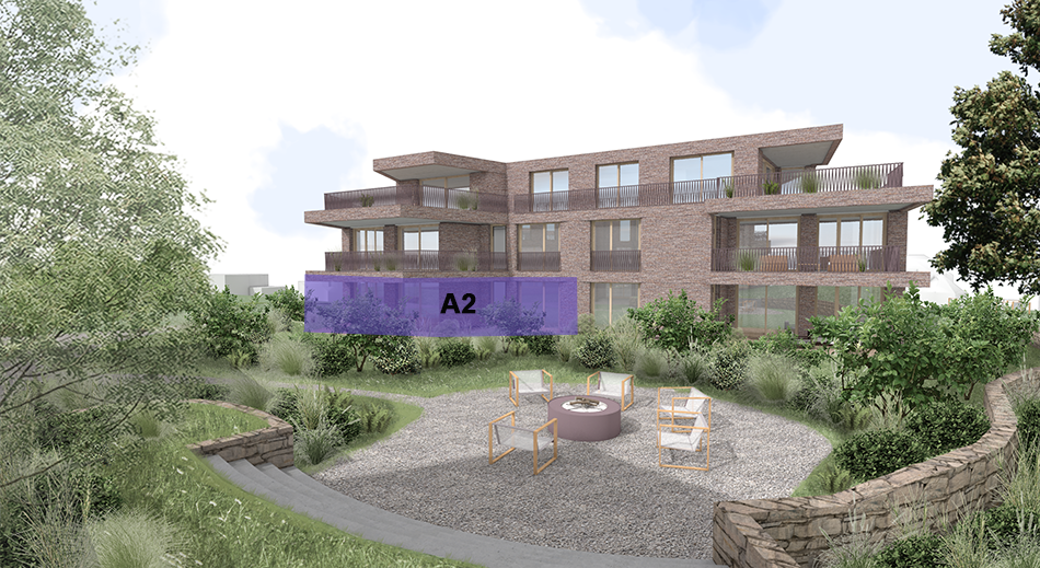• 4-story brick apartment building with balconies, surrounded by landscaped gardens and a patio area with seating and a fire pit