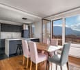 • open kitchen with dining area, glass door to balcony, chandelier
