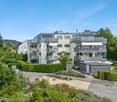 • Multi-story apartment building with wooden exterior, balconies, large windows, and surrounded by lush greenery and landscaping.