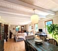 • Spacious open-plan kitchen and dining area with large windows overlooking a garden. The kitchen features modern black cabinets and a white countertop. The dining table has a white top and is surrounded by beige upholstered chairs. A gold pendant light fix
