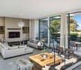 • Spacious living room with large windows overlooking a lush, green outdoor view. The room features a brown sectional sofa, a marble coffee table, and two side chairs. There is also a potted plant and artwork on the walls. The room has a warm, neutral color