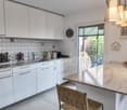 • The image shows a modern, open-concept kitchen and dining room. The kitchen features white cabinets, a dark countertop, and built-in appliances including a dishwasher. The dining area has a wooden table with white chairs, and a decorative mirror on the wa