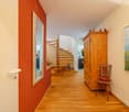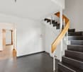 • Wooden stairs, tiled floor, modern wall decoration, entrance area