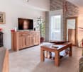 • Living room, sofa, wooden TV unit, flatscreen TV, side table, rug, sliding glass doors to terrace, couch, pillow